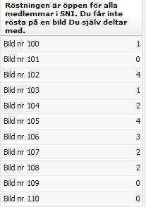 Totalt är det 40 medlemmar som röstat i fototävlingen. Som framgår av redovisningen till vänster så har Bild nr 115 fått flest röster (5).